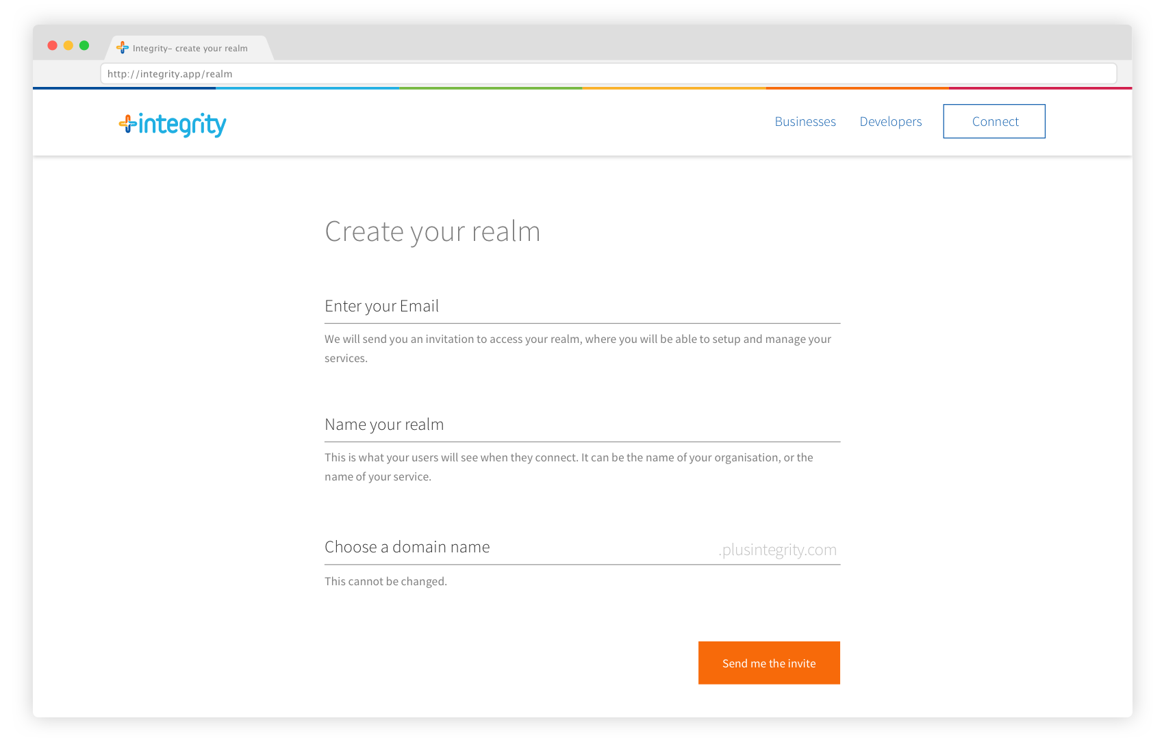 - Choose a domain name for it (you don’t need to have your own domain name, by default your realm will be hosted by Integrity).